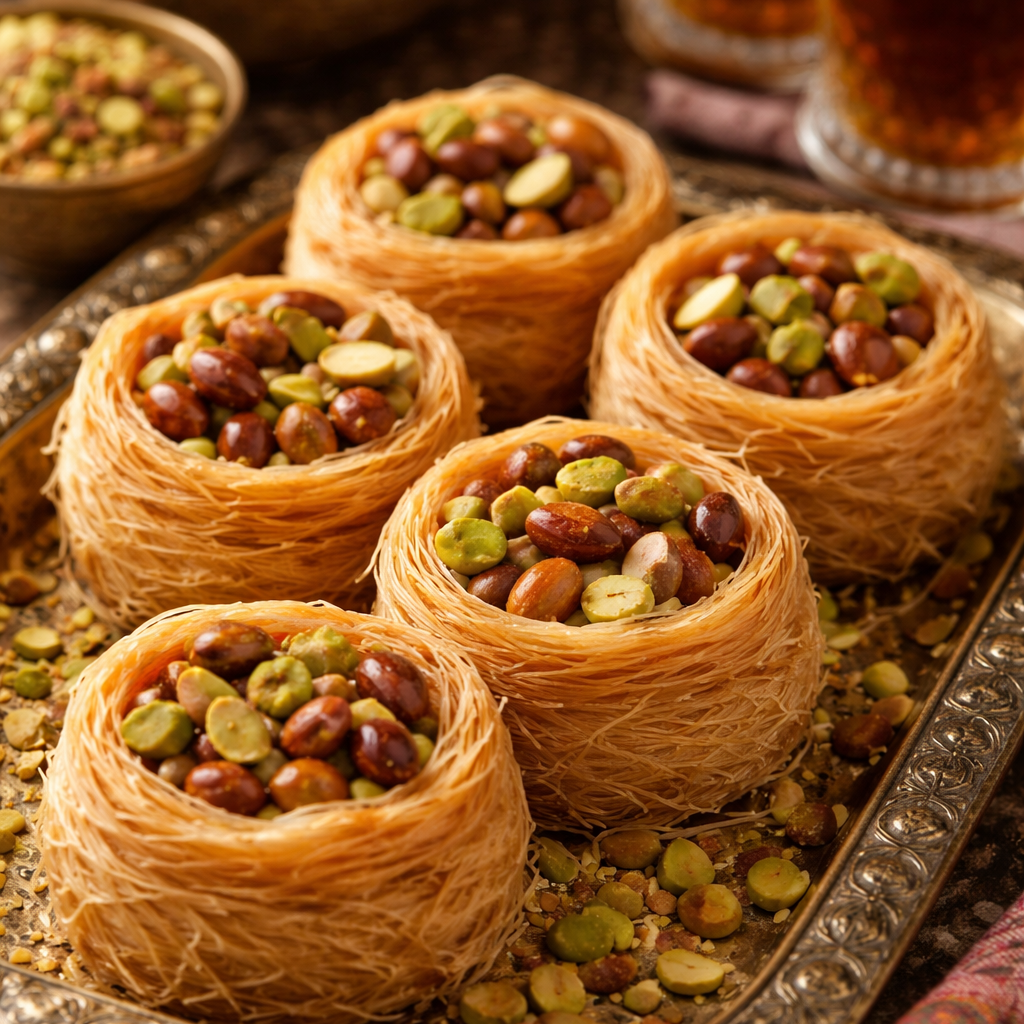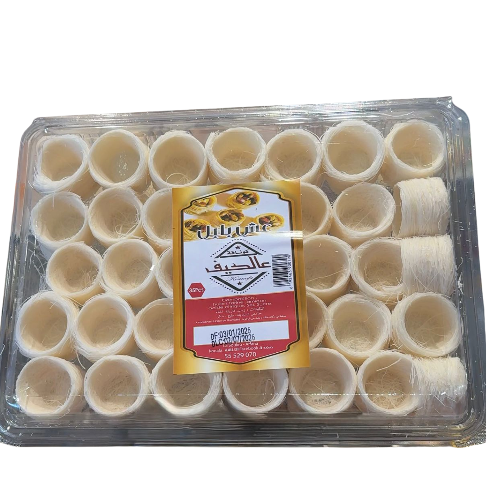 Les Och Bolbol non cuits sont de délicates pâtisseries orientales en forme de nids, confectionnées à base de cheveux d’ange (kounafa). Prêts à être garnis puis cuits, ils permettent de réaliser facilement des desserts traditionnels croustillants et raffinés.